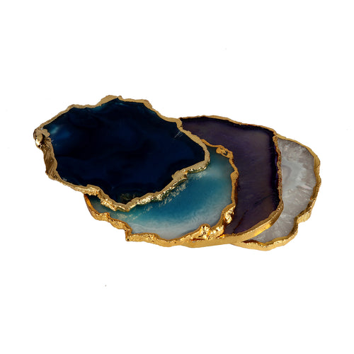 It is an exquisite natural agate dyed colour gold edge coaster set of 4. Agate Stone is found as natural deposits formed by volcanoes and is a semiprecious stone that occurs in volcanic and metamorphic rocks. Its dense crystals make agate stone hard and scratch-proof, creating a perfect set of coasters for your home. The coaster set is decorative and is ideal to be used at a variety of places including your tabletops and your dinner tables.Â