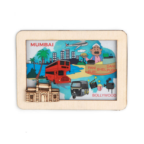 Wood laser cut print laminated fridge magnet bhelpuri wala has unique hand drawn design laser cut veneer wood iconic gateway of India, colourful laminated print representing the vibrant colourful city of Mumbai with iconic landmarks, Bhelpuriwala, dream city of various transport modes. A beautiful memento representing Mumbai exclusively designed and crafted with a rubberised sheet magnet. It has front clear acrylic and is backed with a rubberised magnet.  Wood laser cut print laminated fridge magnet bhelpuri wala is an exclusive décor and collectibles gift item for various occasions like birthday, anniversary, housewarming, and weddings. Add a lot of beauty to the house with this wonderful masterpiece. Please note print colour may vary subject to availability in stock.